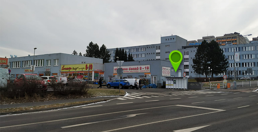 po levé straně od obchodu Eurocenmarket, ulice Seifertova Školní 52