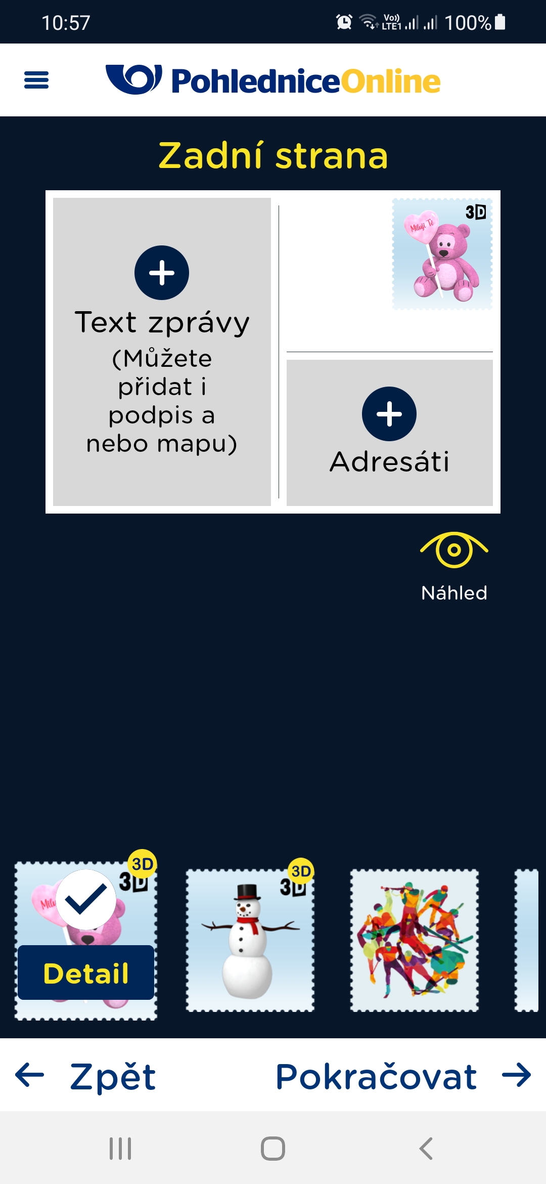 - V aplikaci vložte foto, zvolte rámeček a vytvořte pohlednici. Vyberte si z galerie známku se symbolem 3D.