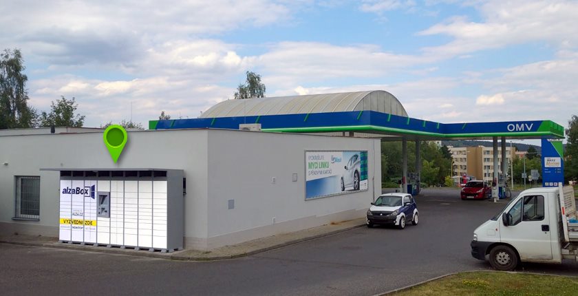 u čerpací stanice OMV, napravo od vjezdu do mycí linky Podbrdská 528