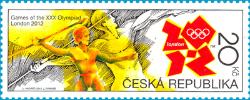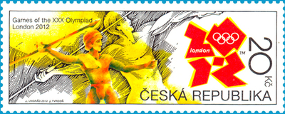 Na známce je zobrazen hod oštěpem, který byl na starořeckých olympijských hrách, konaných od roku 776 př. n. l., významnou součástí pětiboje - pantathlonu. V popředí je dominantní bronzová plastika oštěpaře z klasického 5. století př. n. l., se současným oštěpařem v pozadí, připomínají dlouhou tradici olympismu a postavení atletiky coby královny sportu. Logo londýnských her tvoří druhou dominantu na známce. Základem moderního, ale také hojně diskutovaného loga je letopočet 2012. Jeho grafické zpracování připomíná styl uličních graffiti. Od něho se odvíjí i další vizuální prvky provázející londýnské hry 2012. Náměty kupónů jsou věnovány vodním sportům - úspěšným disciplinám českých sportovců. Olympioniky na kupónu reprezentuje veslař, paralympiky pak plavkyně. Oba kupony doplňují loga ČOV a ČPV.