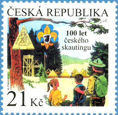 Na známce jsou vyobrazeni skauti dívající se na tábor umístěný v lese a skautský znak.