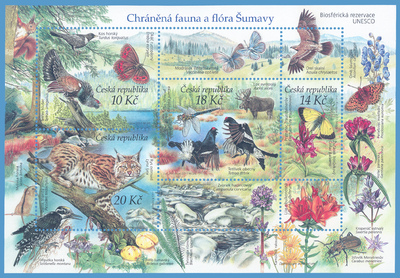 Kat. číslo - 0694: poslední známce o nominální hodnotě 20Â Kč dominuje Rys ostrovid (Lynx lynx) a Datlík tříprstý (Picoides tridactylus). Rozměr známky je 50 x 40 mm Čtyři kupóny doplňují celkovou kompozici aršíku. Na aršíku se nachází další fauna a flóra, která se ve zdejší krajině vyskytuje.