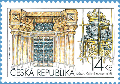 Na známce je vyobrazen vstupní portál domu a barokní soška Černé Matky Boží přenesená na nárožní fasádu kubistického domu z původního domu rytířů Granovských. Dům u Černé Matky Boží je vrcholné dílo české kubistické architektury. Vystavěn byl v letech 1911-12 podle návrhu českého architekta Josefa Gočára. Nachází se na Starém Městě mezi Celetnou ulicí a Ovocným trhem. Název pochází od barokní sošky, která je umístěna na jeho průčelí. Dnes je v něm umístěno Muzeum českého kubismu Národní galerie v Praze. Dům u Černé Matky Boží stojí na místě původního barokního domu rytířů Granovských, po kterém převzal jeho název. Byl vystavěn původně jako obchodní dům na základě požadavků obchodníka Františka Herbsta. Zajímavostí je, že původní Gočárův návrh domu nesplňoval požadavky posuzovatele stavby - pražského magistrátu - na dokonalý soulad s historickým prostředím. Gočár na to reagoval tak, že dům doplnil o další kubistické prvky - např. více kubistický vchod nebo balkónové zábradlí. V suterénu byla původně vinárna, v prvním patře kavárna a ve druhém obchody s textilem. Třetí patro bylo určeno pro kanceláře a čtvrté pro byty. Kubisticky byl zařízen i interiér včetně nábytku a ostatních detailů. Původní kavárna zanikla už ve dvacátých letech 20. století - údajně pro nemodernost kubistického stylu - a na jejím místě vznikly kanceláře. Tento trend pokračoval i později a byl završen v padesátých letech, kdy celý dům využíval pro svou kancelářskou činnost národní podnik Výstavnictví. Na začátku 90. let byl dům zrekonstruován podle projektu Karla Pragera. Během rekonstrukce byl uveden do původního stavu, byly odstraněny staré nátěry a byla dostavěna i část prosklené střechy v souladu s původním Gočárovým návrhem, který nebyl původně realizován. Za účasti prezidenta Václava Havla byl 18. října 1994 dům slavnostně otevřen. Své sídlo zde získalo České muzeum výtvarného umění; v části domu byla i stálá výstava českého kubismu. Později - v roce 2000 - se na roh domu dostala i polychromovaná řezaná kopie původní sošky černé Madony. V roce 2010 byl dům zařazen na seznam národních kulturních památek. Muzeum zde skončilo svoji činnost v roce 2002, ale výstava českého kubismu byla obnovena v roce 2003 pod hlavičkou Národní galerie. V roce 2005 byla v prvním patře znovu otevřena kavárna Grand Café Orient. Na počátku devadesátých let 20. století byl Ministerstvem kultury ČR dům poskytnut na krytí cca 300 milionového úvěru pro rozjezd loterijní hry zvané "Česká lotynka". Když projekt "lotynky" zkrachoval, hrozilo, že stát o vzácný dům přijde, neboť bude poskytnut bance jako splátka za nepokrytý úvěr ze zkrachovalé loterijní hry. Státní fond kultury situaci řešil půjčkou od Komerční banky na splátky úvěru.