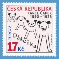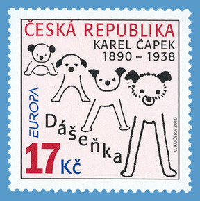 This year's central theme for the annual EUROPA issue, announced by the Association of European Public Postal Operators PostEurop, is Children's Book. Dášeňka aneb život štěněte (Dashenka, or the Life of a Puppy) by Karel Čapek is one of the best known and most popular Czech books, not only with children. Karel Čapek was born in Malé Svatoňovice. His brother, Josef Čapek, was a famous writer, painter and photographer. Dashenka is an example of their frequent cooperation. After his studies, Karel worked as a tutor to the son of Count Lažanský, but soon took the position of a journalist, editing several newspapers: Národní listy, Nebojsa, Lidové noviny. He left the latter in 1921 as a protest against the sacking of his brother Josef by the paper's board. For the next two years he was a dramaturg at the Vinohradské Theatre. He was the first president of the Czech PEN Club in 1925-1933. He married his long-time friend, Olga Scheinpflugová, almost at the end of his life. After 1938 he became the target of political attacks. He spent the last years of his life in Stará Huť by Dobříš where he is still commemorated by a monument. He died of pneumonia, several months before his planned arrest by the Gestapo. Dashenka, or the Life of a Puppy is a book more than 70 years old. Iris, Dashenka's mother, was a wire-haired terrier living with Čapek. The book describes Dashenka's birth and early life until the day when she is carried away by her new owners, and a number of other stories (Stories for Dashenka, On Dogs' Habits, On People, etc.). The stories are accompanied by photographs of Dashenka, made by Josef Čapek. Karel Čapek wrote a large number of books, the major including War with the Newts, R.U.R., The White Disease, Krakatit, etc.