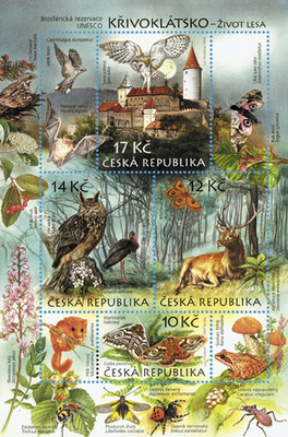 Příležitostný poštovní aršík se 4 známkami a 4 kupony zabývající se chráněnými druhy živočichů a rostlin na Křivoklátsku, jemuž dominuje ve známce 17 Kč hrad Křivoklát: