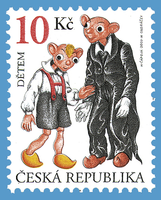 Hurvínka vymyslel, navrhl a vytvořil v r. 1926 Gustav Nosek, synovec K. Noska. Roku 1930 založil prof. Skupa první profesionální loutkovou scénu nového typu pod názvem Plzeňské loutkové divadlo prof. J. Skupy, později přejmenované na Divadlo Spejbla a Hurvínka. Spejblova rodina se ještě téhož roku rozrostla o další členy - Hurvínkovu kamarádku Máničku a pejska Žeryka. Od r. 1945 působí divadlo v Praze. V r. 1971 doplnila základní čtveřici postav paní Kateřina Hovorková - Mániččina pedantická bábinka. Humorně laděné příběhy ze života těchto loutkových hrdinů znají děti téměř na celém světě. Divadlo S+H hraje i pro dospělé diváky, jimž jsou určeny satirické komedie. Na známce doplněné textem DĚTEM je Spejbl s Hurvínkem.