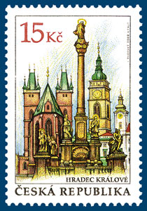 Hradec Králové leží ve východních Čechách na soutoku Labe s Orlicí a patří k nejstarším českým městům. Od r. 1225 byl svobodným královským městem, v r. 1306 jej král Václav II. ustanovil věnným městem českých královen. Jeho historické jádro je městskou památkovou rezervací. Na známce je část Velkého náměstí s pozoruhodným seskupením věží z různých historických období. Jsou zde dvě 40 m vysoké věže gotického katedrálního kostela sv. Ducha, vedle stojící renesanční Bílá věž, jedna ze dvou hodinových věží staré radnice a morový sloup v popředí. Známka je doplněna textem HRADEC KRÁLOVÉ.