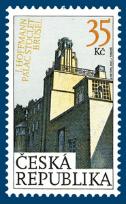 exteriér - pohled z ulice na část budovy Paláce Stoclet v Bruselu s věží, která je ukončena kupolí se čtyřmi figurami. Známka je doplněna texty J. HOFFMANN - PALÁC STOCLET - BRUSEL. Námětem společné emise je palác Stoclet v Bruselu, který je dílem našeho rodáka Josefa Hoffmanna (1870-1956). Palác Stoclet, postavený v letech 1905-1911, je pokládán za jeho vrcholné architektonické dílo. Dvě známky zobrazující interiér a exteriér paláce vyjdou u nás i v Belgii ve shodném grafickém provedení, ale v příslušných jazykových mutacích.