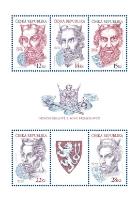 0480: Václav III. (1305-1306) - se ujal vlády v šestnácti letech. Vzdal se odbojných Uher a snažil se zachovat si Polsko, ale na počátku tažení proti svým polským odpůrcům byl 4. srpna 1306 v Olomouci zavražděn. Více než čtyři sta let vládnoucí dynastie Přemyslovců vymřela po meči. Na známkách jsou portréty králů a období jejich dědičného panování. Portréty jsou doplněny medailony charakterizujícími jednotlivé panovníky. Portrét Přemysla Otakara I. doplňuje rubová strana jeho Zlaté buly, v medailonu Václava I. je detail jeho pečeti, u Přemysla Otakara II. je znak s Českým lvem, portrét Václava II. doplňuje pražský groš, v medailonu Václava III. je Svatováclavská orlice. V meziarší je kresba vladařských insignií a text Dědiční králové z rodu Přemyslovců, na kuponu uprostřed dolní části aršíku je symbol českého státu - dvouocasý lev s korunou ve skoku.
