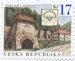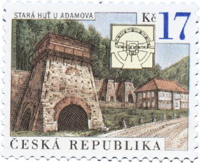 ve které je dnes umístěna expozice železářství péčí Technického muzea v Brně. Na známce je zobrazena původní vysoká pec s ostatními objekty a nákresem půdorysu pece.
