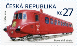 Slovenská strela is the name of an express train famous for its fast speed, first operated in July 1936 on the route between the Czech capital Prague and the Slovak capital Bratislava. It originally ran with unique mid-1930s motor units M 290.0 (Tatra 68), which cut the travel time by more than an hour as compared to the then fastest train pulled by a steam engine. The regular travel time of 4 hours and 18 minutes was not overcome until the 21st century. The motor units were so fast that they earned their nickname “Slovenská strela” (Slovak for “Slovak Arrow”). The train was identified as MR 175 (on the route to Prague) and MR 176 (on the route to Bratislava) where MR stood for “fast motor train” in Czech. This was the first motor train of its kind used in Czechoslovakia. The train was out of service during World War II.