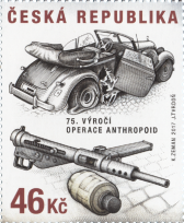 Heydrichův vůz zničený výbuchem Kubišovy bomby plněné plastickou trhavinou. Dále autor na známku ztvárnil ležící Gabčíkův samopal.