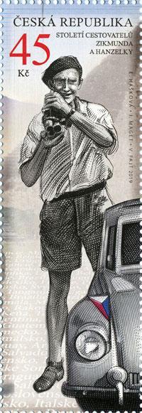 Na pozadí aršíku je schematicky naznačena trasa výprav Hanzelky a Zikmunda v podobě české trikolory.