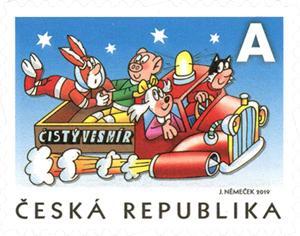 0130 — čtveřice kamarádů z Čtyřlístku letící v autě na modrém pozadí nebe symbolizující čistý vesmír