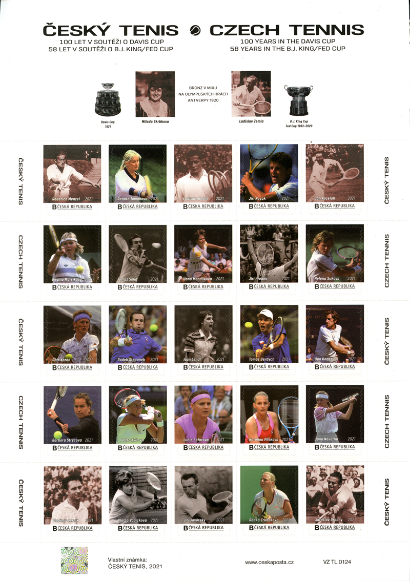 vyobrazeni nejúspěšnější (podle počtu reprezentačních účastí) čeští tenisté a tenistky, kteří slavili úspěch v soutěžích DAVIS CUP a B.J. KING CUP (dříve FED CUP). Jednotlivé Vlastní známky nesou jména vyobrazených tenistů a tenistek.