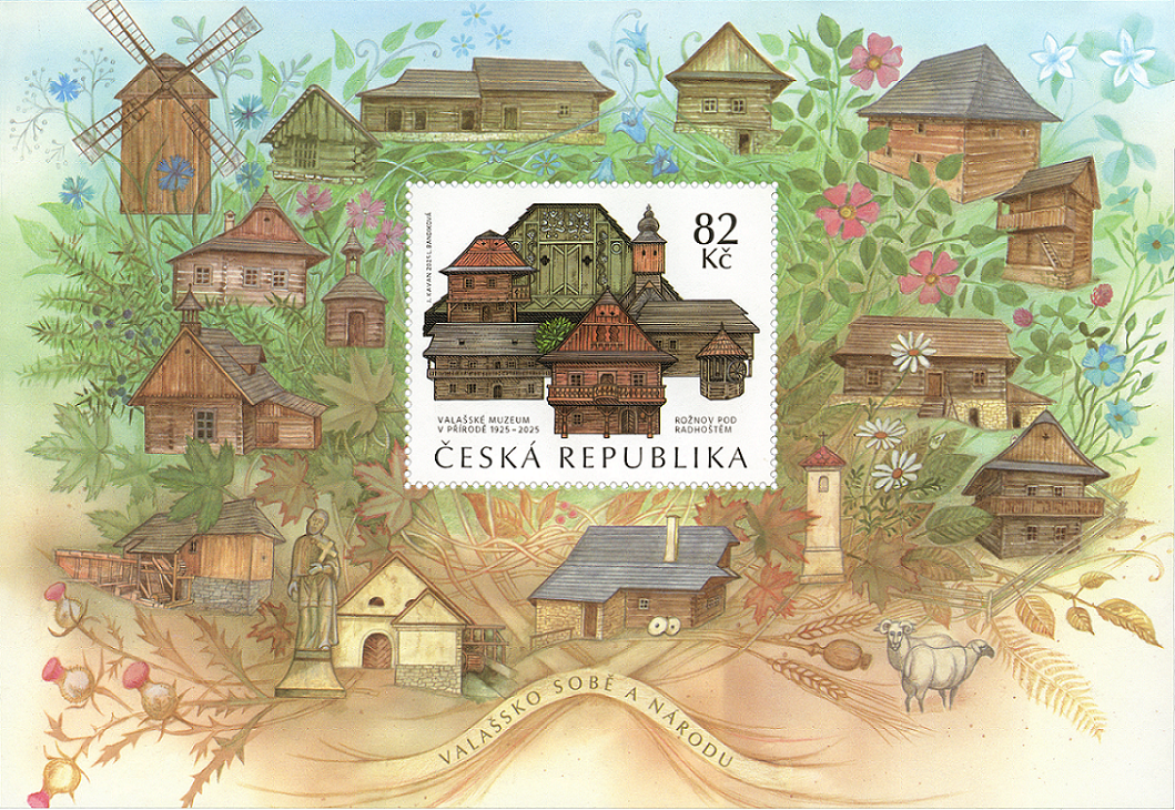 Dřevěné městečko, nejstarší jádro expozice ve Valašském muzeu. Na aršíku se kolem známky vine věnec valašské vegetace, ze které se vynořují objekty vybrané ze dvou novějších prohlídkových okruhů. Technický důmysl zdejších obyvatel dokládají památky z Mlýnské doliny, zatímco život zemědělců a pastevců přibližuje Valašská dědina. Okrové odstíny v dolní části navozují podzimní náladu. Směrem vzhůru pak zelená a světlá modř ztělesňují přírodu v plném rozkvětu. Známka a aršík zobrazují celé stavební objekty.
