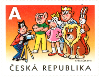 Myšpulín the Cat taking a photo of Bobík the Pig, Fifinka the Missy Dog, Piňda the Rabbit, and the King