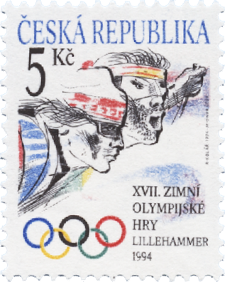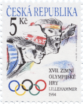 lyžování - běh mužů. Kresba dvou běžců je doplněna olympijskými kruhy a textem: XVII. ZIMNÍ OLYMPIJSKÉ HRY LILLEHAMMER 1994