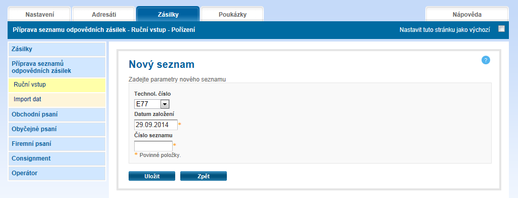 – uloží zadané údaje – zobrazí se tabulka „Seznamy odpovědních zásilek“ s nově založeným seznamem