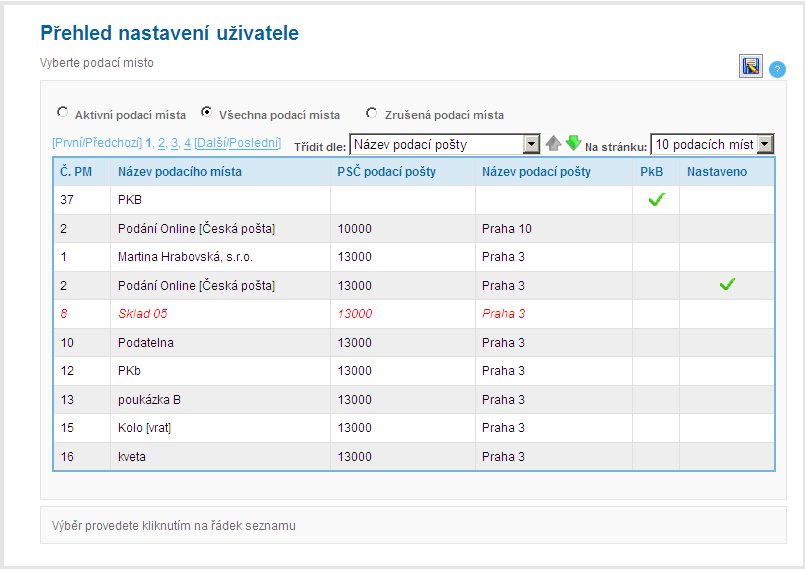 Tabulka „Přehled nastavení uživatele“ zobrazuje přehled o nastavení podacích míst a podacích pošt, které jsou přiřazeny danému