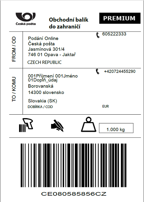 Pokud je pořízena zásilka typu Obchodní balík do zahraničí (CE) a u adresáta je uveden ISO kód státu, kde je povinný nový adresní štítek,