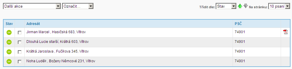 – stav zásilky je zobrazen pomocí zelené ikony – je zobrazena u zásilek, které jsou pořízeny bez